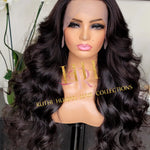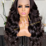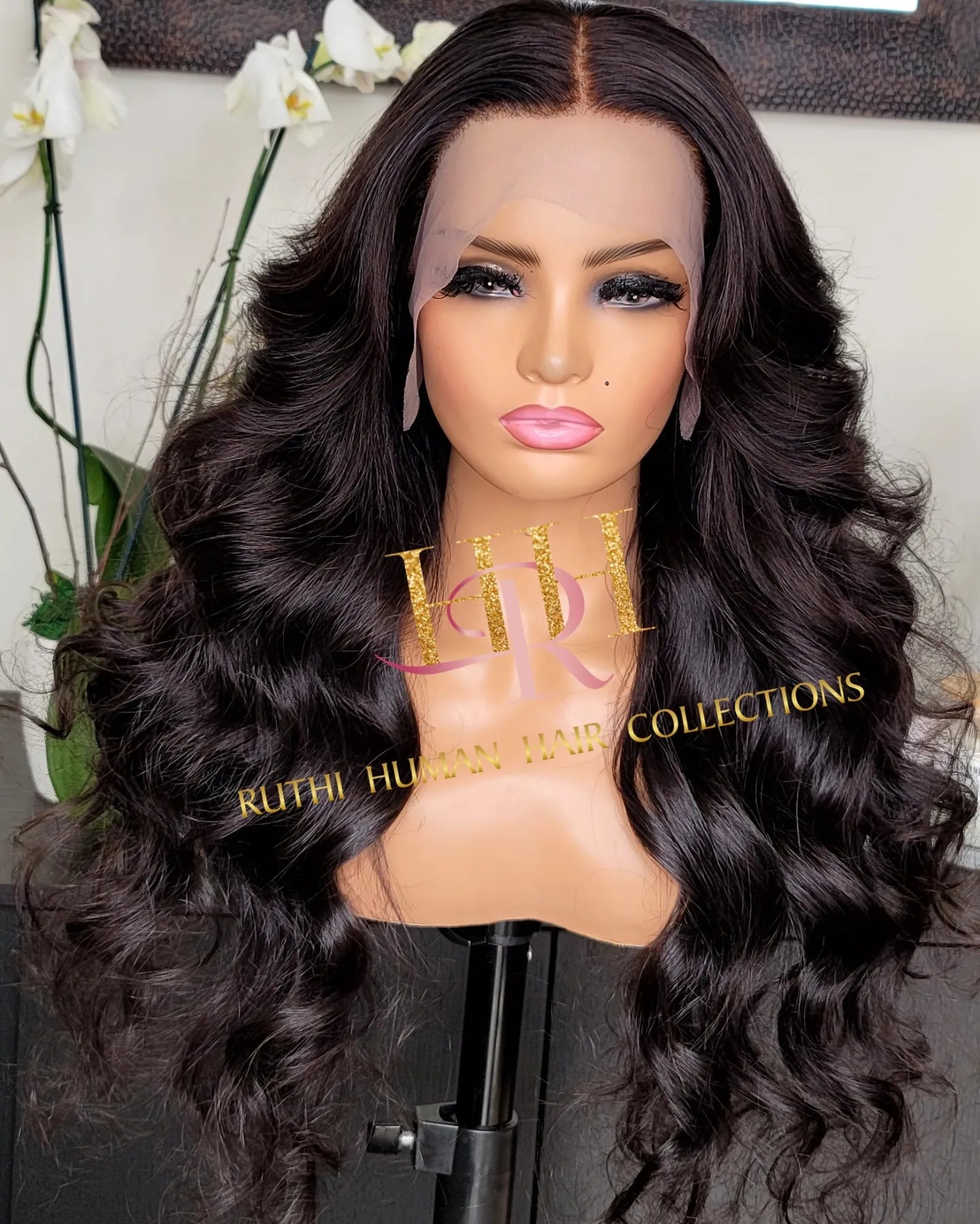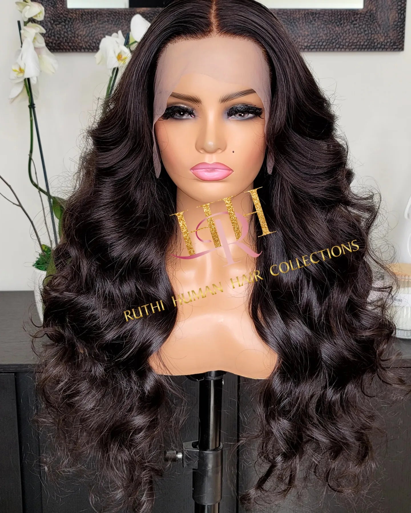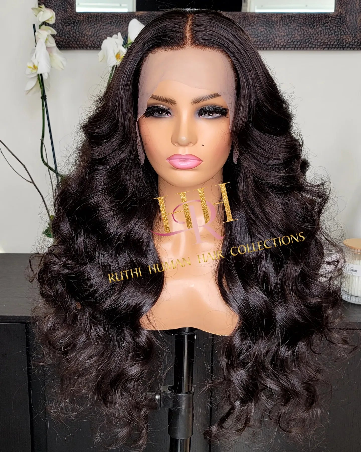 our wigs are Machine made with Ruthi Human Hair raw body wave, cuticle aligned hair. Comes in the natural color, which can vary from dark to slightly light brown. Will be styled as a pic above.