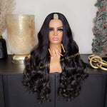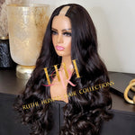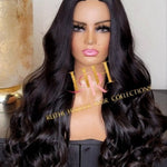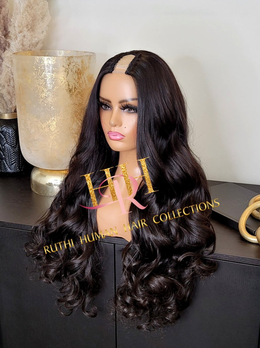 our wigs are Machine made with Ruthi Human Hair raw body wave, cuticle aligned hair. Comes in the natural color, which can vary from dark to slightly light brown. Will be styled as a pic above.