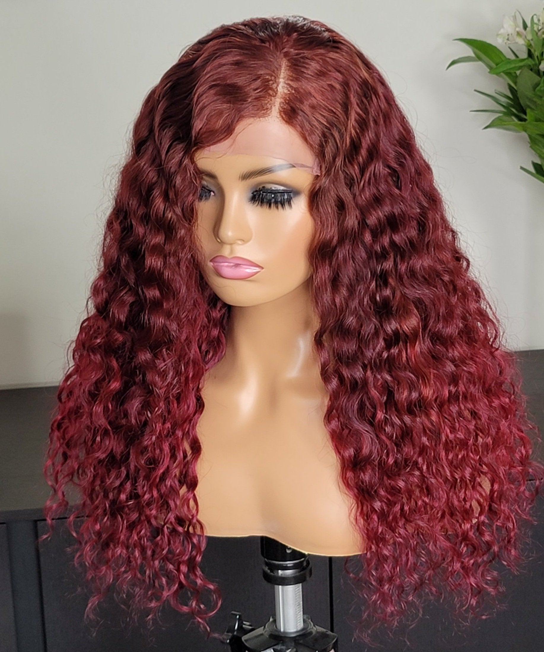100% Humanhair lace closure wig custom colored Burgundy natural curly