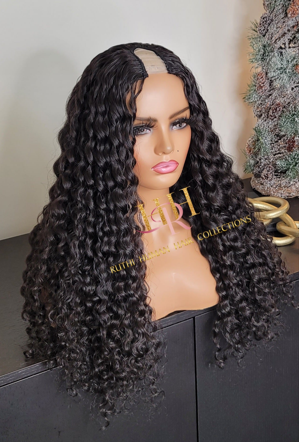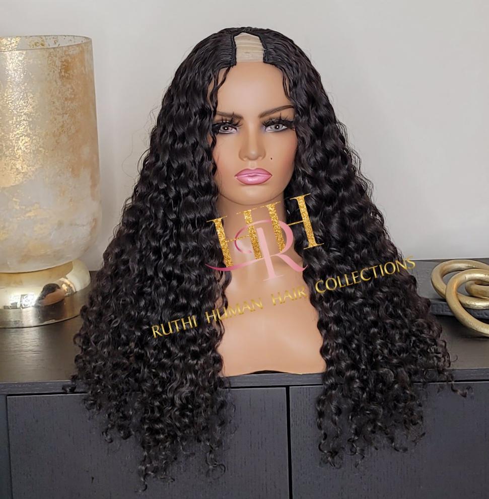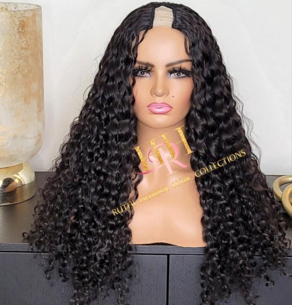 Our wigs are Machine made with Ruthi Human Hair raw body wave, cuticle aligned hair. Comes in the natural color, which can vary from dark to slightly light brown. Will be styled as a pic above.