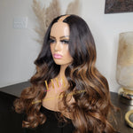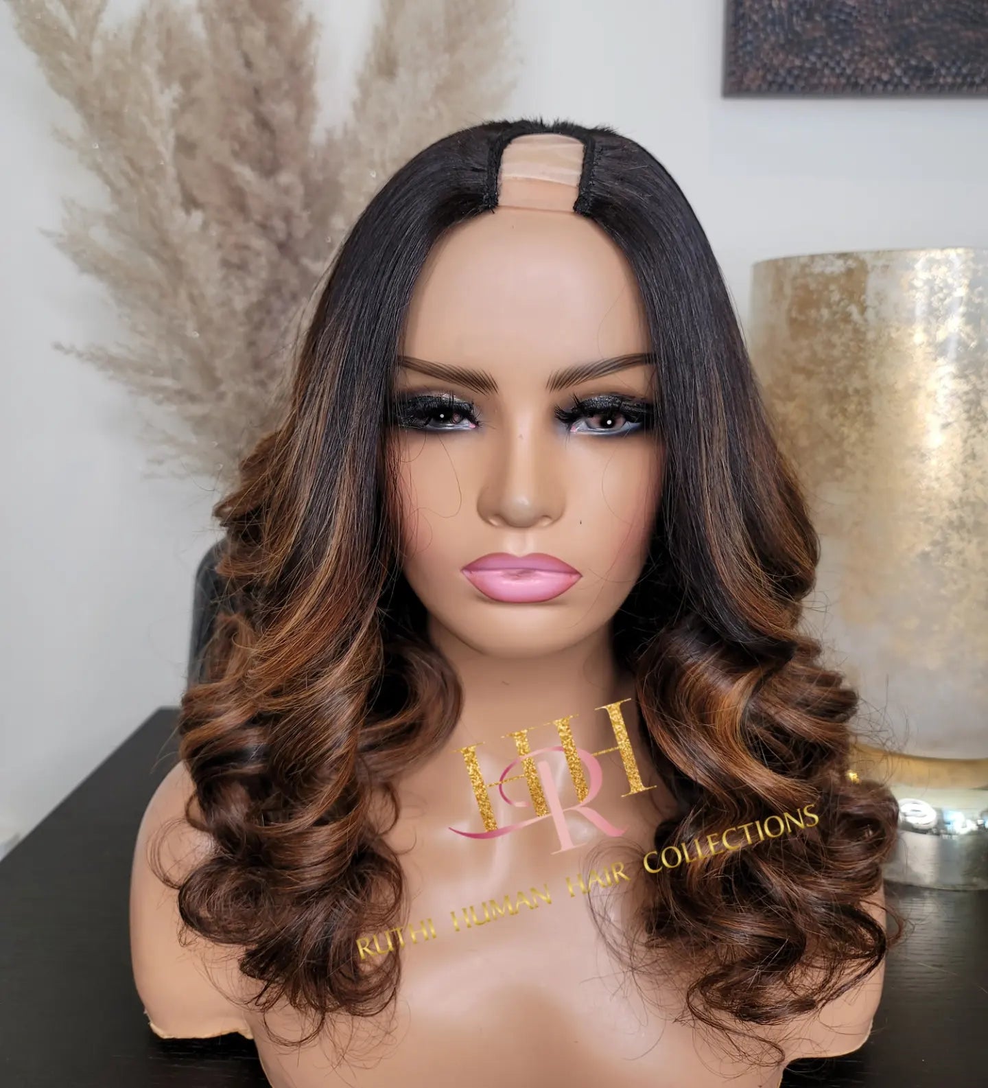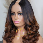 Our wigs are Machine made with Ruthi Human Hair raw body wave, cuticle aligned hair. Comes in the natural color, which can vary from dark to slightly light brown. Will be styled as a pic above.