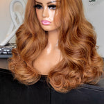 Our wigs are Machine made with Ruthi Human Hair raw body wave, cuticle aligned hair. Comes in the natural color, which can vary from dark to slightly light brown. Will be styled as a pic above.