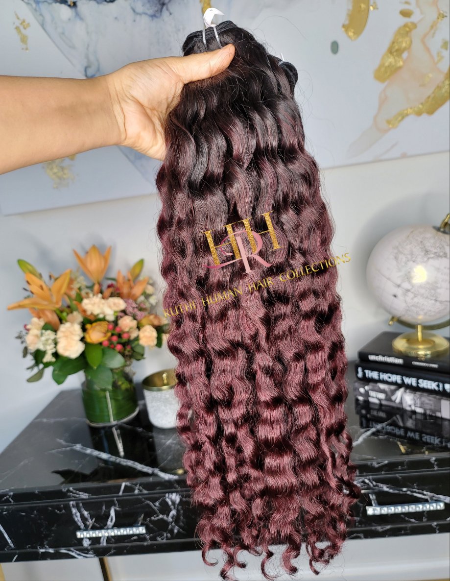 100% Raw Human hair cuticle intact Bundles, wavy Burgundy Ombre colored curly
